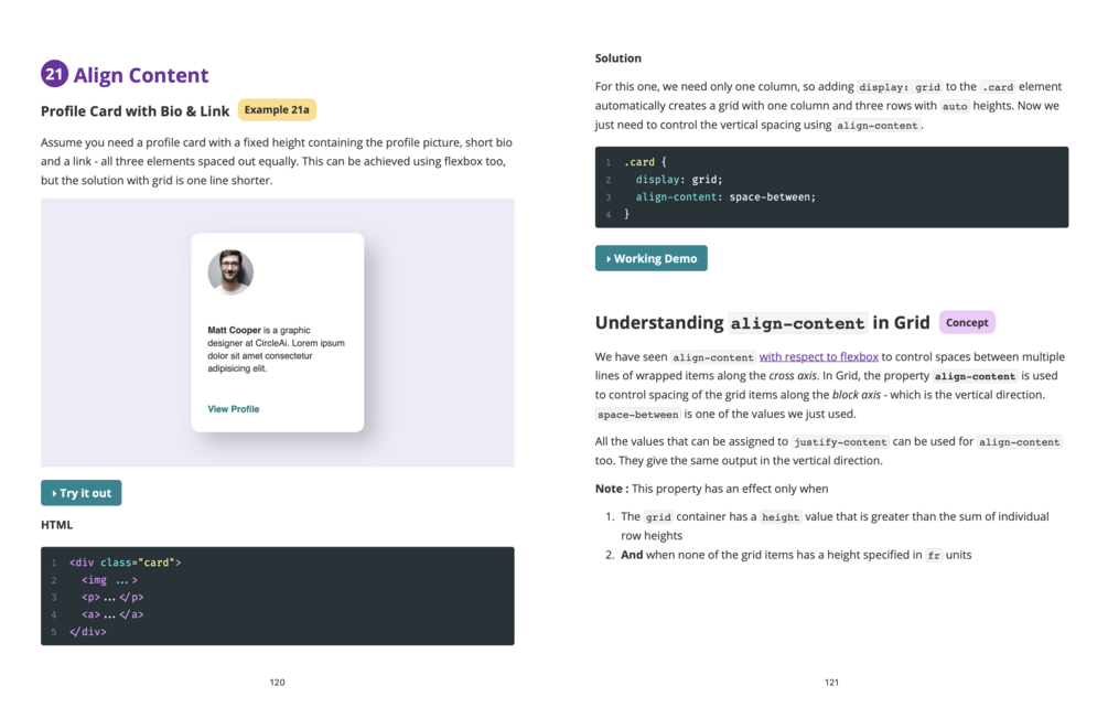 This book takes a completely different approach. I won't teach you the things flex and grid can do. Instead, I will first show you some components and layouts and make you think how to build them using the CSS concepts you already know. Now you have a problem, and you want a solution. That's when I introduce the concepts you "need" to know.